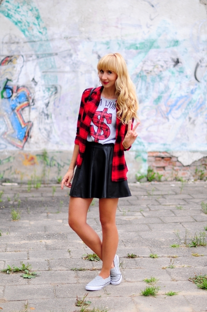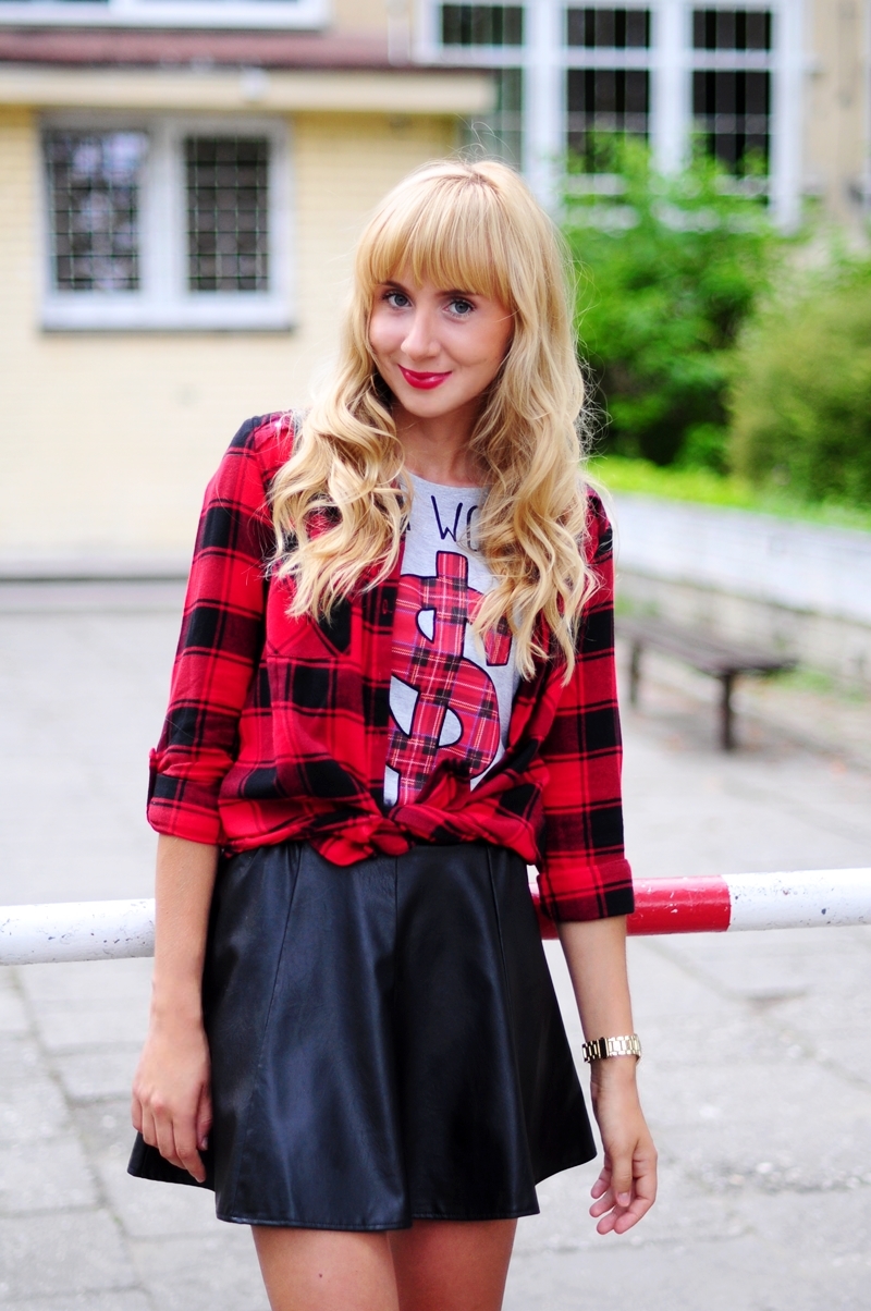 Powroty do szkoły nie zawsze muszą kojarzyć się z szarością i nudą. Dziś udowadniamy, że można wyglądać stylowo zawsze i wszędzie. Co zatem będzie rządzić tej jesieni? Oczywiście krata! Kasia założyła koszulę z tym motywem, łącząc ją z $ T-shirtem i skórzaną spódniczką. W szkole stawiamy przede wszystkim na wygodę, na długie godziny lekcyjne płaskie tenisówki sprawdzą się idealnie. Magda dla kontrastu postawiła na kraciastą spódniczkę i bluzkę z czerwonym napisem, a na biodrach zawiązała bluzę. Hope you'll like it :-)