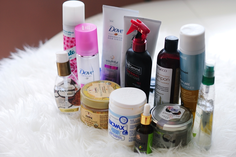 Urządzenia termiczne ograniczyłam do minimum, szczególnie w momencie gdy tak zaczęły wypadać mi włosy. Mimo to nadal używam mojego ulubionego olejku z Organix na końcówki. Gdy zakładam na noc papiloty, lubię lekko spryskać moje włosy mgiełką z Timotei, która delikatnie utrwala skręt. Czasami również lekko podsuszam kłaczki, a przed ciepłem suszarki chroni je sprej termalny z Tresemme.