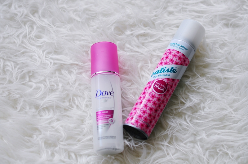 Gdy moje włosy są jeszcze lekko wilgotne po myciu, lubię spryskać je odżywką w spreju z Dove, która znacznie ułatwia rozczesywanie moich długich i gęstych włosów. Moim niezastąpionym wybawcą okazał się również suchy szampon z Batiste, który ratuje mnie w kryzysowych sytuacjach, gdy moje włosy że tak powiem "nie wyglądają". Są wtedy oklapnięte, lekko tłuste. Produkt nadaje im objętości, odświeża i nadaje cudnego zapachu!